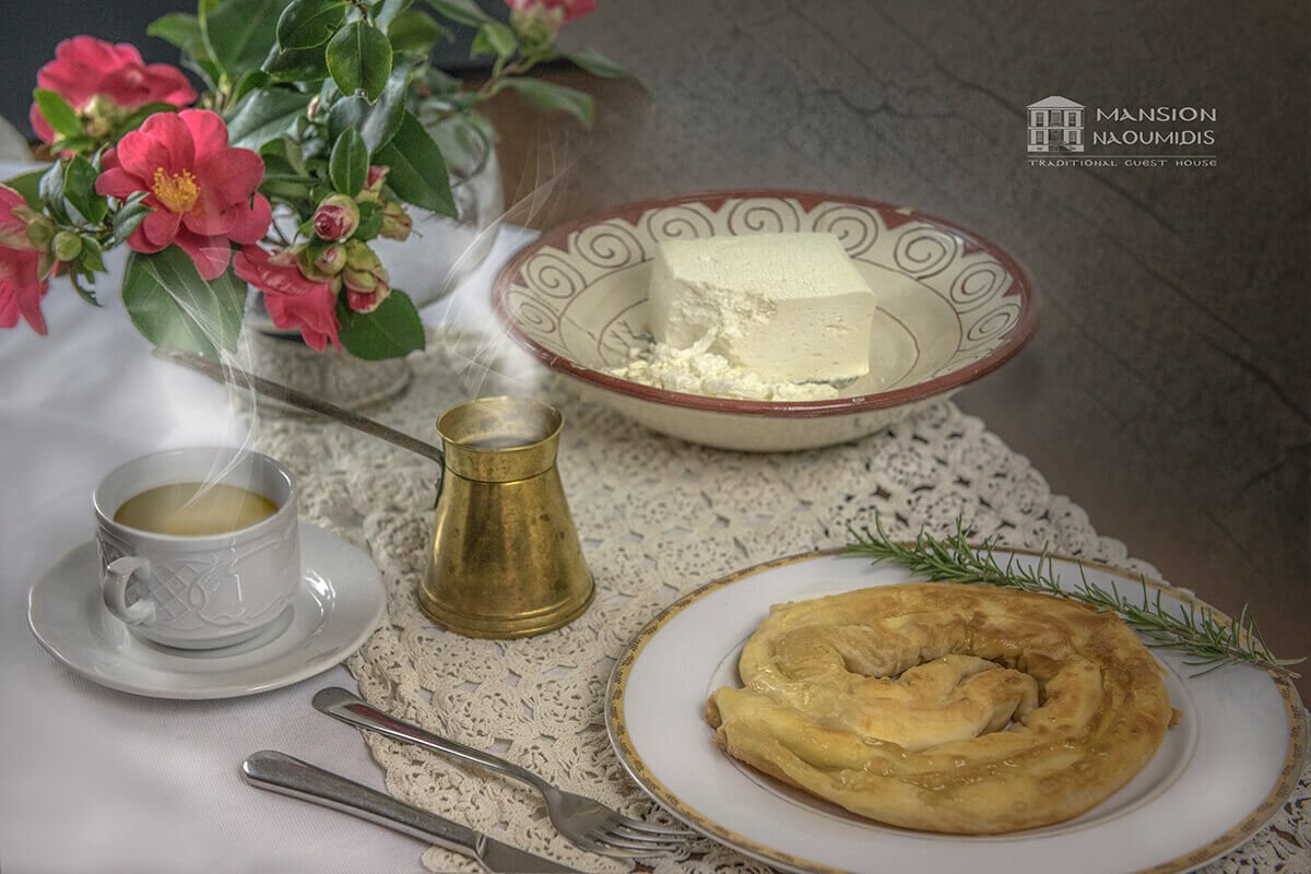 Το χειμώνα δίπλα στο τζάκι, το καλοκαίρι στην όμορφη αυλή μας κάτω από την αιωνόβια καστανιά μπορεί κανείς να γευτεί ομελέτες, αυγά με φρέσκια ντομάτα, γιαούρτι με μέλι και καρύδια, πίτες με σπιτικό φύλλο, τυρόψωμο, ελιόψωμο, τηγανοκουλούρες, μηλόπιτα, πάστα φλώρα,τραχανά και λουκουμάδες το χειμώνα, φρέσκα φρούτα το καλοκαίρι και φρεσκοστυμμένο χυμό πορτοκαλιού όλες τις εποχές.